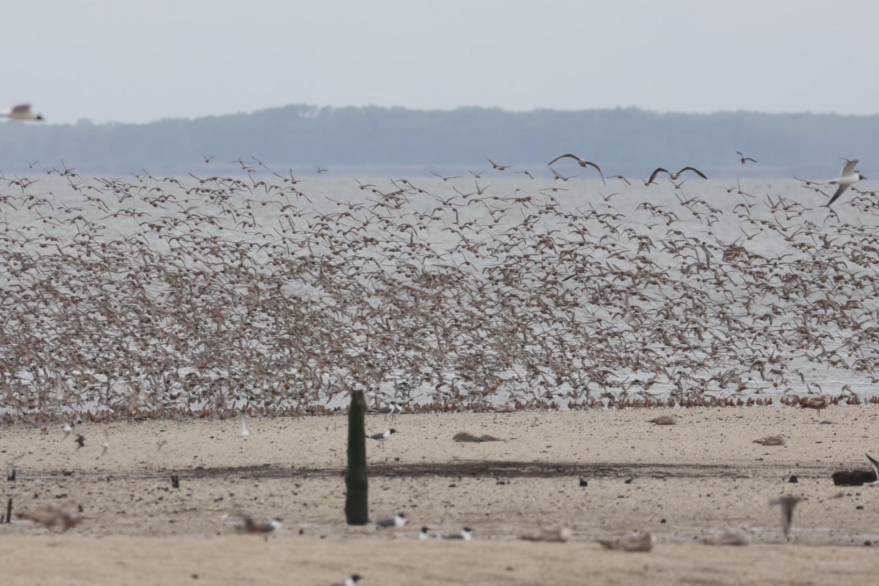 Shorebird stewards may not wear capes but they are superhero’s to the multitude of shorebirds stopping along the Delaware Bay in the spring. During May, the beaches in New Jersey are an important stopover for these migratory birds who are mainly feeding on the horseshoe crab eggs, deposited during the annual horseshoe crab spawn. The shorebirds, which include the red knot a NJ endangered species, have a short window to reach their ideal weight before leaving on the next half of their journey north to breed. Eight beaches in Cape May County and two in Cumberland County have restricted access during the migration so that the shorebirds can feed undisturbed.