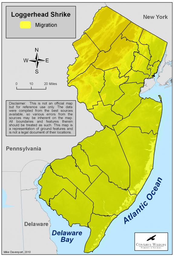 Due to severe population declines and habitat loss, the loggerhead shrike was listed as an endangered species in New Jersey in 1987. Rare throughout much of the Northeast, the loggerhead shrike is also listed as endangered in New Hampshire, Vermont, Massachusetts, New York, Pennsylvania, Maryland, and Virginia. Habitat loss is still considered to be the main threats to loggerhead shrikes in New Jersey today.