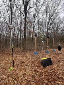 To address this challenge, this year’s project introduced an experimental approach, UV light lures. Installed at 8 of the 16 existing bat house clusters, these devices emit specific wavelengths of light that attract insects. The idea is by increasing insect abundance near the bat houses, bats may be drawn in more frequently to forage, increasing the likelihood that they explore and eventually use the nearby roost structures. The Conserve Wildlife Foundation of New Jersey was invited to join this effort due to my prior experience installing and deploying light lures in a previous role, which brought valuable expertise to the project’s design and implementation.
