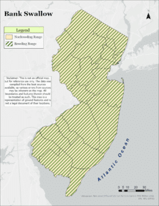 In New Jersey, the bank swallow can be found breeding throughout the state in areas with suitable habitat and nest sites. They can also be seen throughout the state during migration.