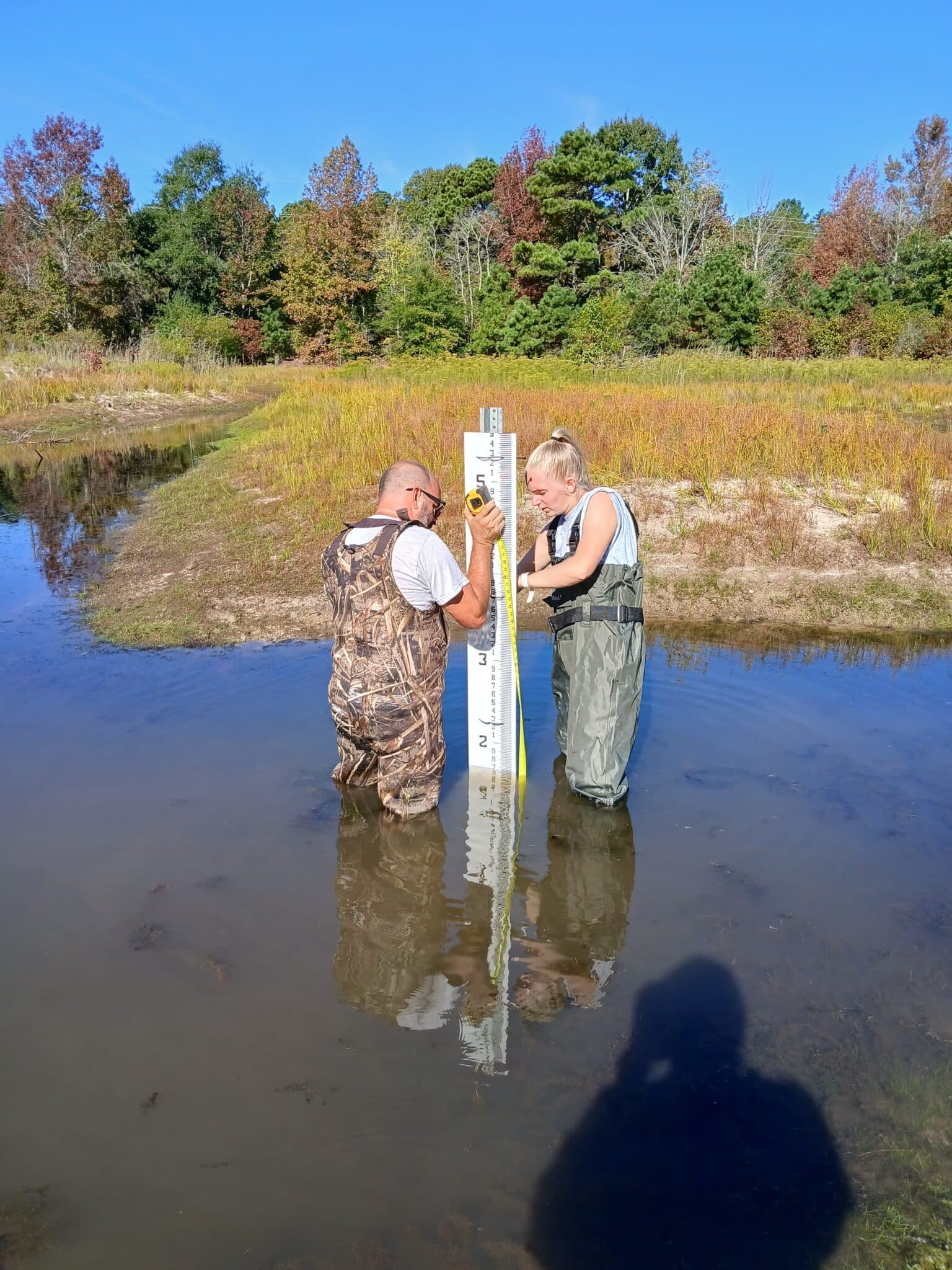 ENSP Senior Zoologist Bill Pitts and Darby Brant install a water gauge at a ETS breeding pool.
