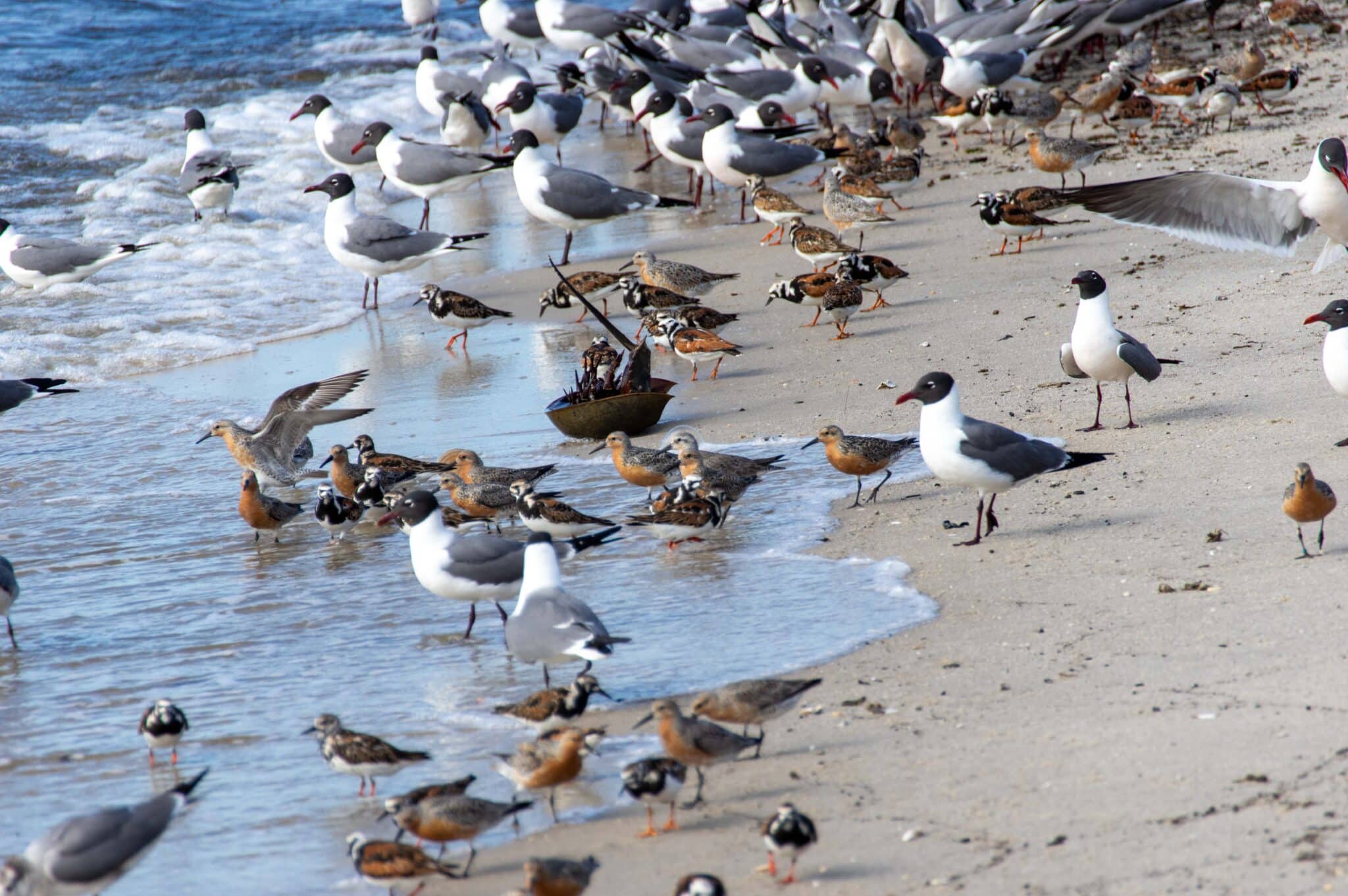 A group of the infamous Red Knots: Calidris canutus, Semipalmated Sandpipers: Calidrus pusilla, and Ruddy Turnstones: Arenaria interpres, at the beach on Roosevelt Blvd., photo: C. Franceschini