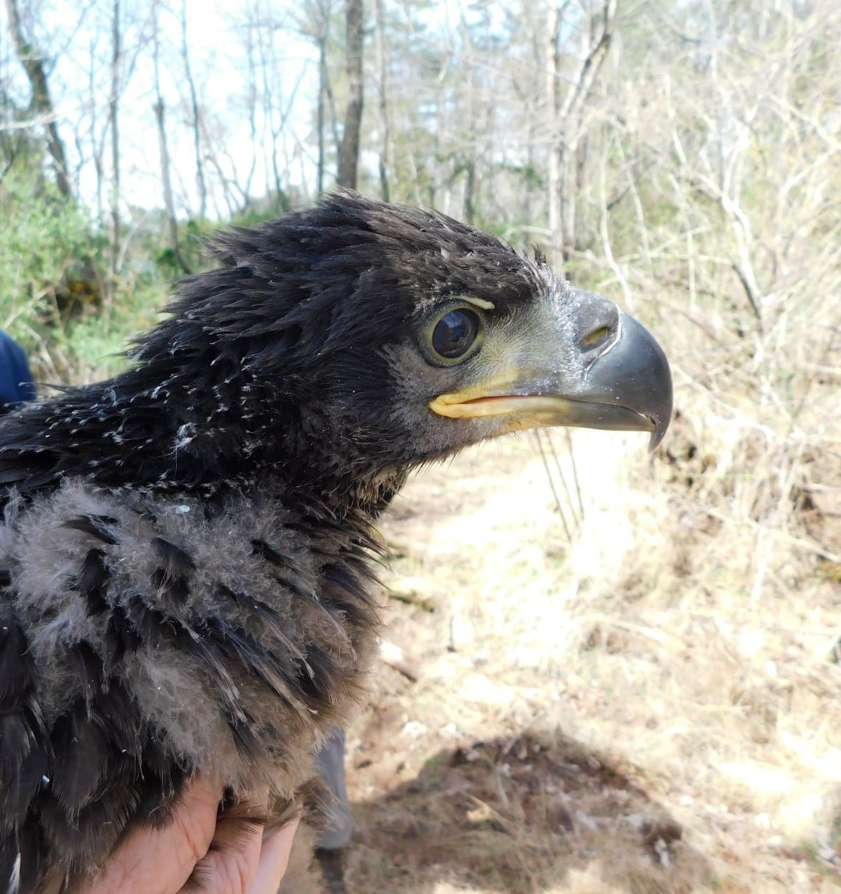 I had confidence that with this group, someone was sure to spot something!! Imagine my absolute surprise and delight when Steve, a talented and devoted local eagle watcher emailed the group that he had found “my” sub adult and gotten a clear image of her green band: H22!! She is one of “mine” which I held at banding in 2022. I was overcome with emotion and excitement! I would never have known that H22 was alive and thriving if not for Steve’s search and photos. Right on cue, Mary Ellen, another Eagle Project volunteer produced emails and photos that I had sent to the group after the 2022 banding showing H/22 as a 6-week-old nestling. How heartwarming it was seeing her again as a nestling!