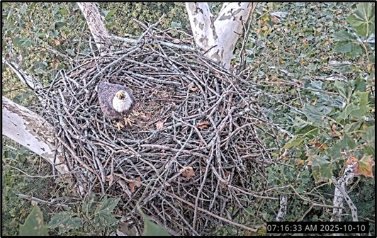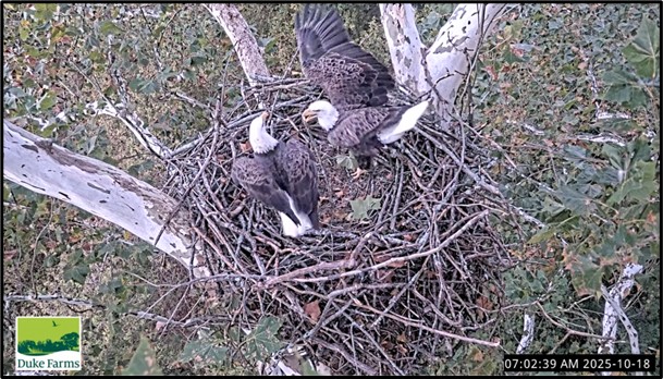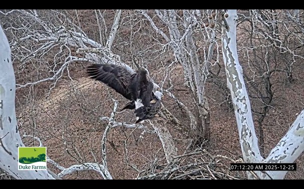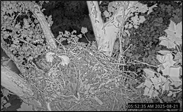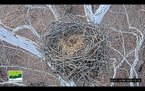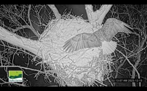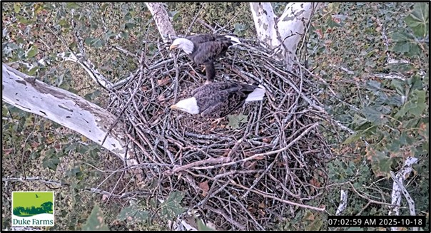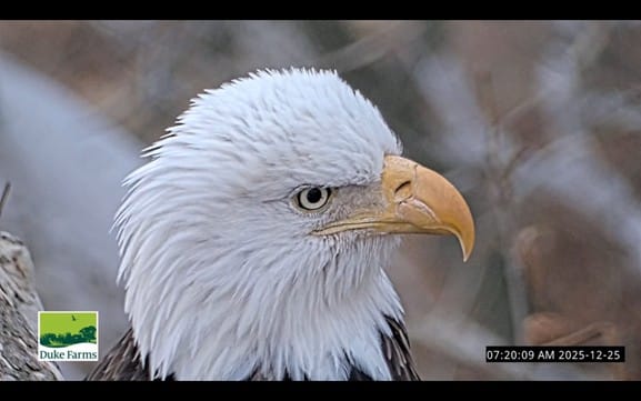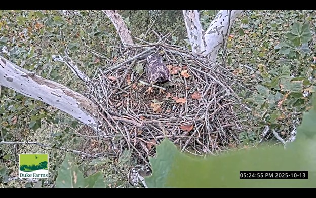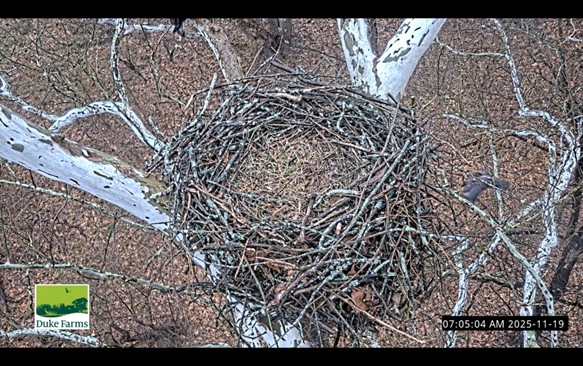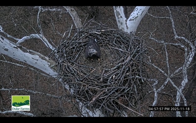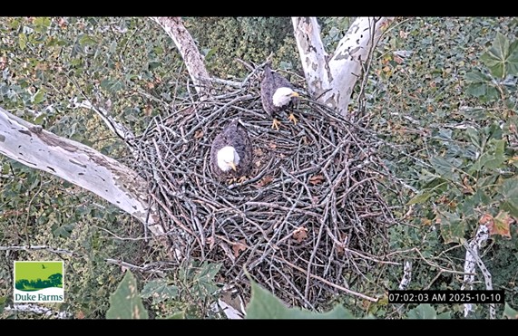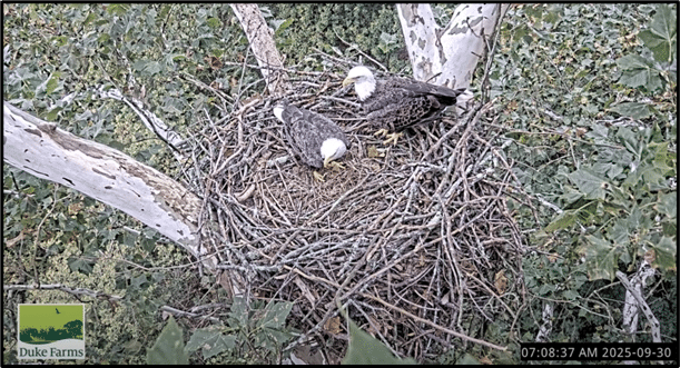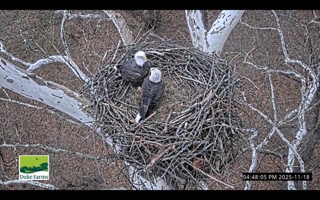The eaglets from the 2025 nesting season are gone. They have left behind a nest that is beat up. The adults don’t live on the nest, but they are nearby making their presence known in their territory. They begin rebuilding the nest early. This pair, the 3rd at Duke Farms, begin in late August. Bald Eagles have been nesting in a private part of Duke Farms since 2004. The live cam has been online since 2008. Last year’s cam upgrade brought sound for the first time! Be sure to watch with the volume on.