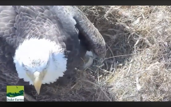 Viewers see the adults roll the eggs frequently as they incubate. This is to ensure all sides of the egg are kept warm, and prevents any part of the developing embryo/eaglet from sticking to the inside of the shell.
