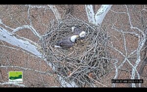 The nest monitor for Duke Farms is Diane Cook and in past years she’s been able to keep track of the nest by watching the eagle cam. Due to the cam being down, Diane has been in monitoring the nest in the field from a safe distance so she doesn’t disturb the pair.