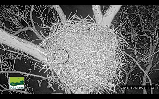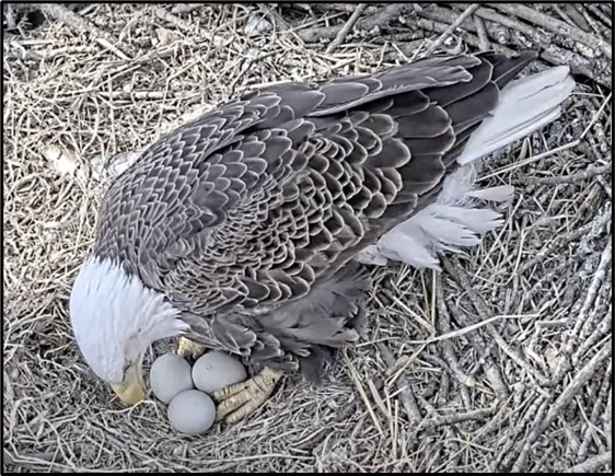 Duke Farms Female 3 laid her first clutch of 3 with the original male A59. Only 2 hatched and fledged. Last year, in 2025 with Duke Farms Male 2, she again laid 3. All were banded and fledged. Now here she is again with a clutch of 3 eggs. Let’s hope for another year like last!