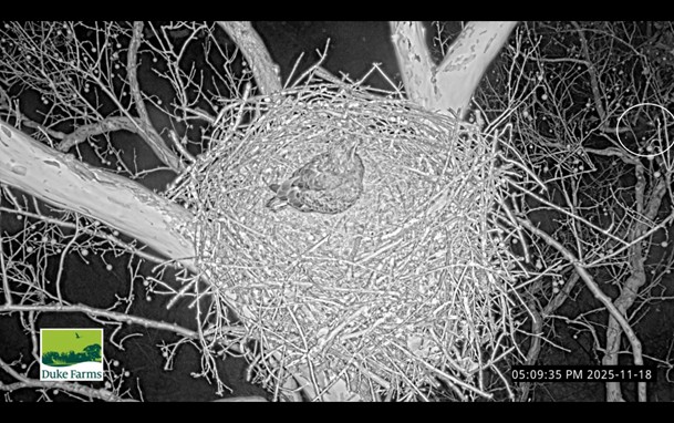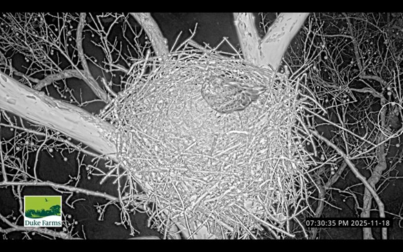 The female was finally tucked and sleeping. Her mate is doubtless watching over the nest from a nearby branch just out of cam view.