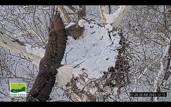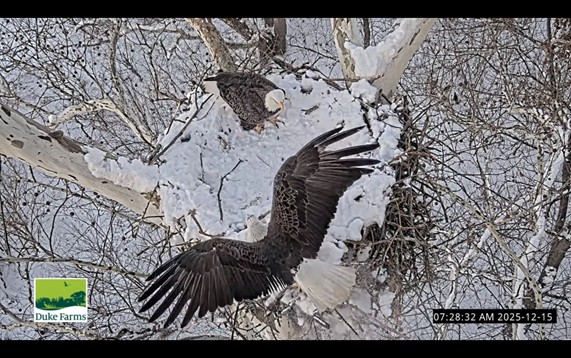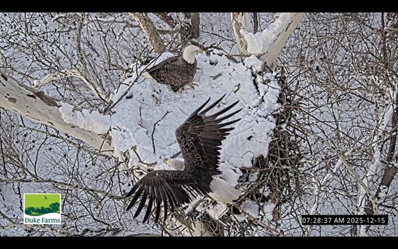 The nest had a couple immature eagles visiting over the last months. They seemed to have moved on, at least in the cam view. An eagle with a white head and tail arrived in the wee hours of the morning on December 15. Who was it? We expect one of the pair, right? Flying down from above the nest, it wasted no time in getting comfortable, and spent the night.