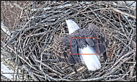 Besides behavior and iris flecks, is there another way to tell if this is the same pair from last year? The color pattern of the feathers at the top of the tail was something on which I focused. I looked for consistency between last year and this. This is not always easy to see in real time. Watching the cam frame by frame, and enlarging images on my laptop shows details. As time goes on and the eagles molt could this pattern change? If the eagle is fully mature are those colors and patterns for life? I am still looking for answers to those questions. For now, I do believe this to be the same pair from last year since this color pattern matches.