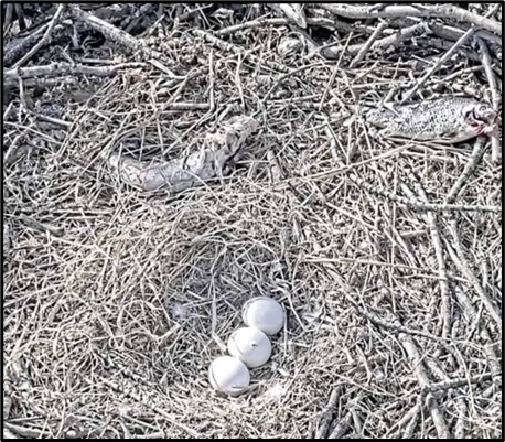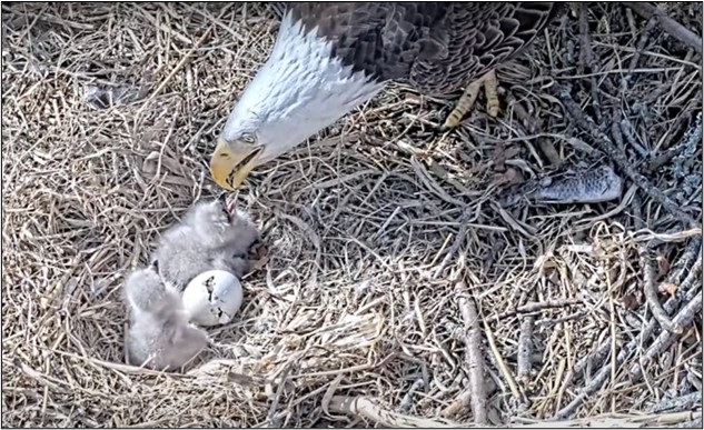 The final sign hatching is on the way is the delivery of prey to the nest. The adults are preparing for the first feeding of their young. How many signs will you observe? Remember, this can be a slow process. Sometimes very strong chicks may hatch faster than others. Eyes to the cam!